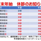 記事年末年始の休業のお知らせ 2025.11.26 年末年始の営業につきましては、平井整形外科リハビリテーションクリニックの休診に伴い、以上の通りとなります。ご了承下さいませ。 Post Share Pin it 10月8日㈬午後の休業のお知らせ前の記事